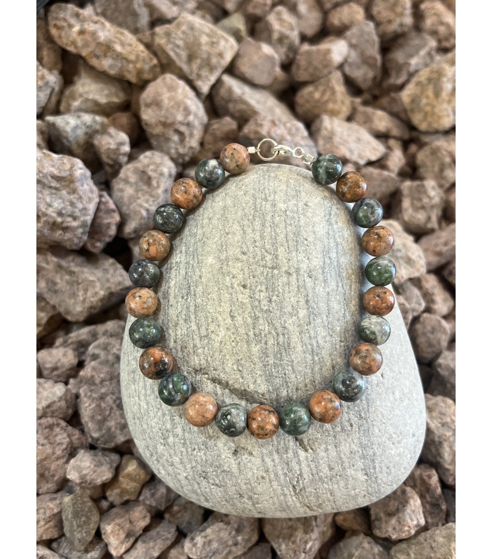 Bracelet perles rondes 8 mm, réalisé avec du Vert d’Orezza, rare pierre semi-précieuse de Corse, Rouge de Porto et fermoir en argent massif 925/ème.