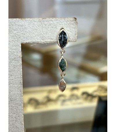 Paire de boucles d’oreille en argent massif 925 réalisées avec le Vert d'Orezza, rare pierre semi précieuse Corse , le Rouge de Porto et la Diorite Noire, pierres naturelles Corse