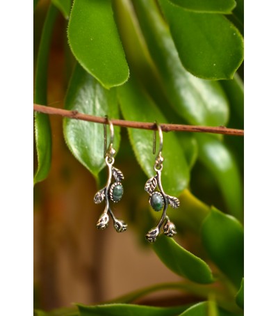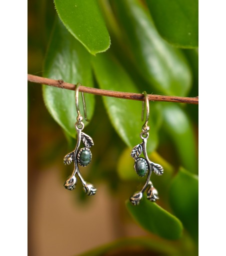 Boucles oreille "rose et feuille" en argent massif 925/ème, réalisé avec le Vert d'Orezza, rare pierre semi-précieuse de Corse.